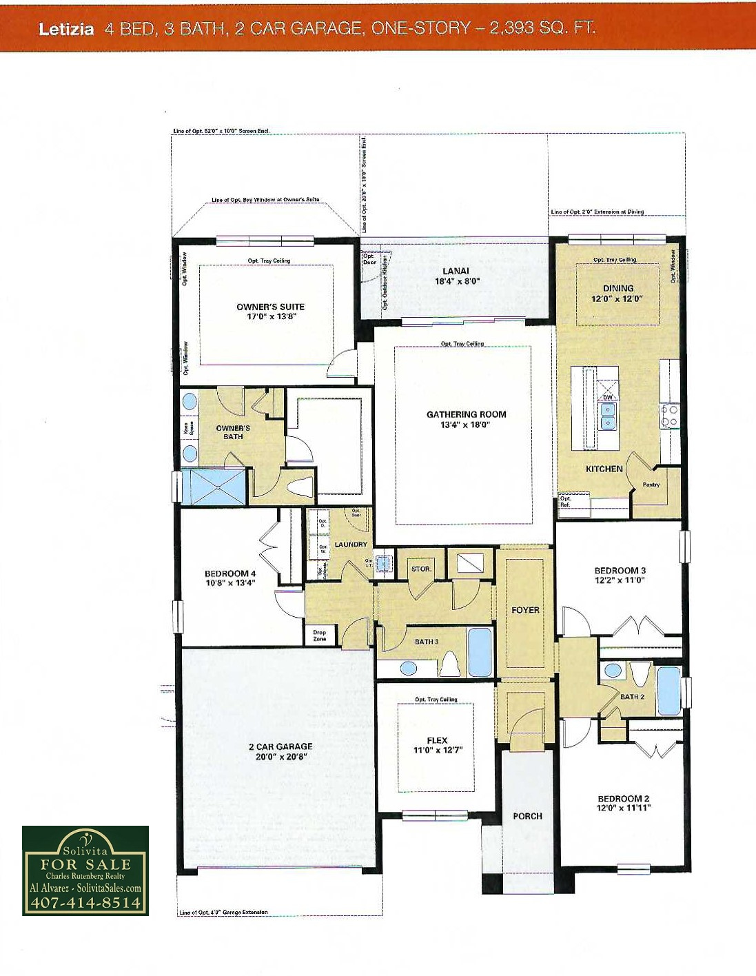 This spacious floor plan features 2,393 sq ft of living space. It has 4 bedrooms, 3 bathrooms, a flex room that could be used as a 5th bedroom, and a chef's kitchen.